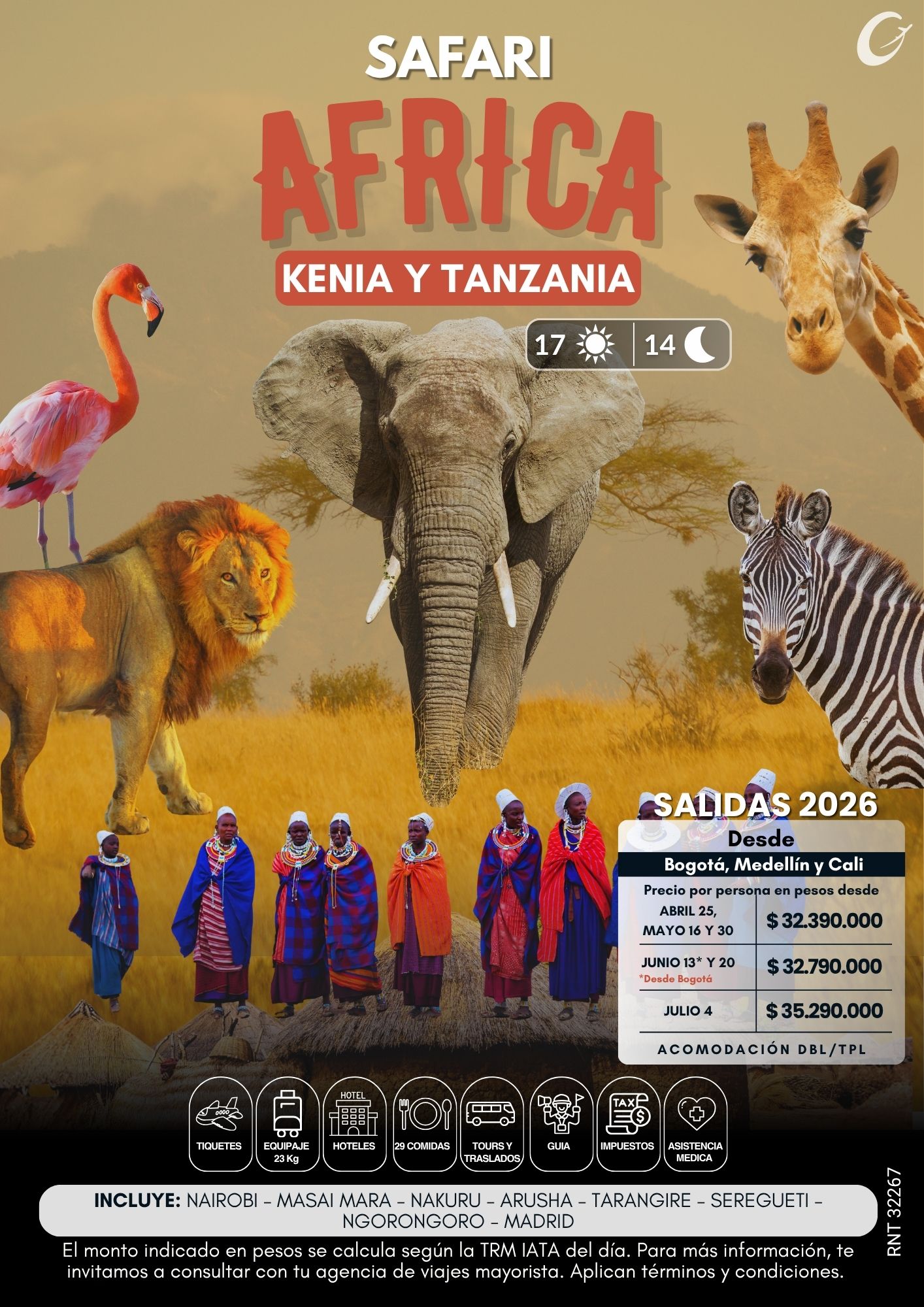 • Vuelos Bogotá – Madrid – Nairobi//Arusha – Madrid – Bogotá. 23 Kg. por maleta en cabina