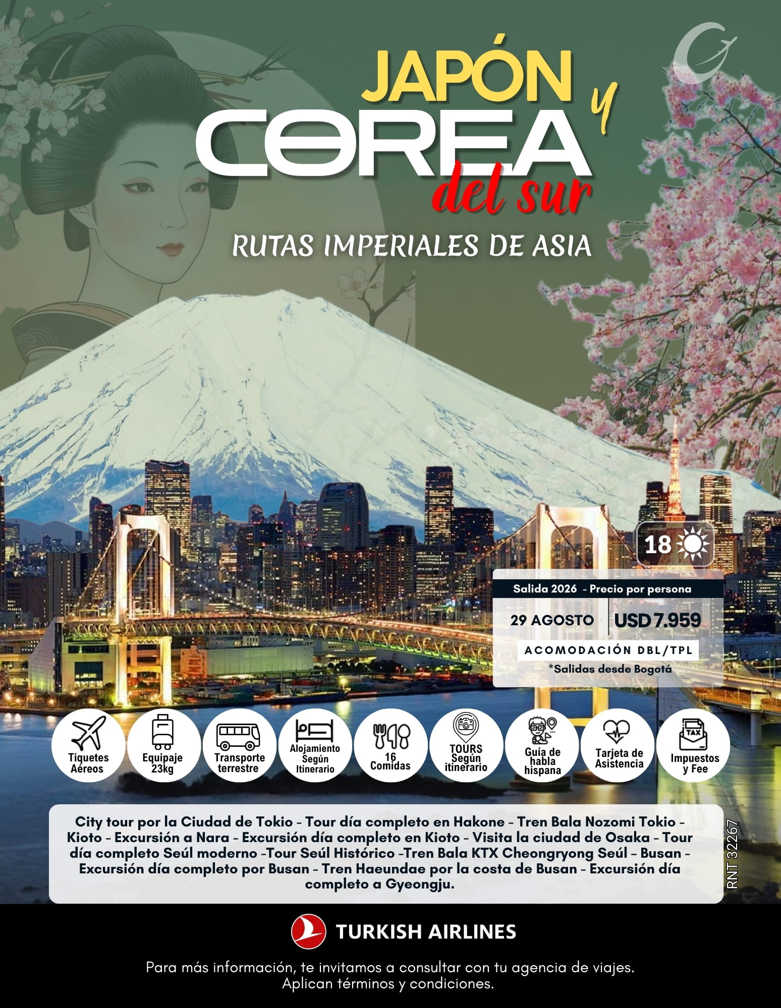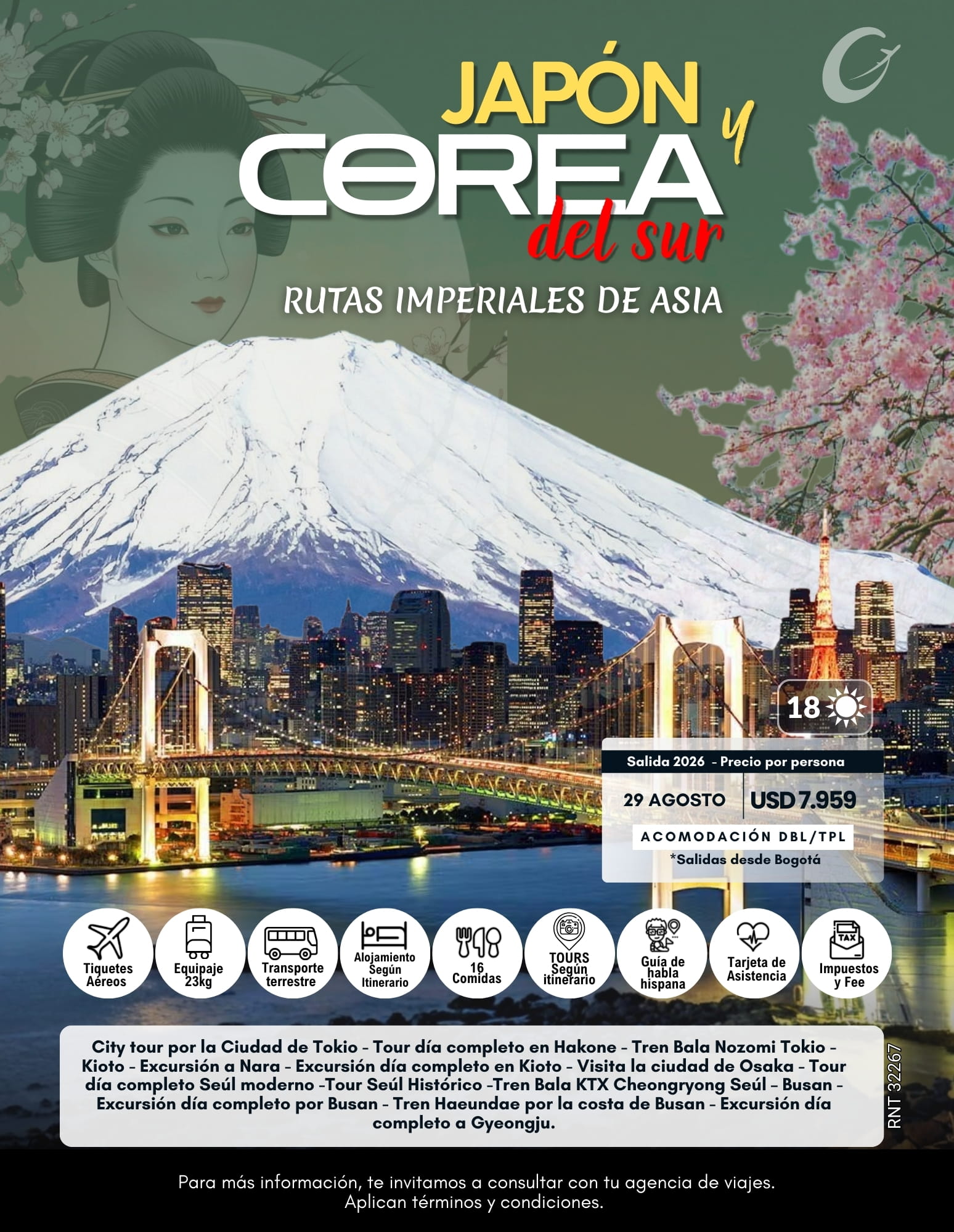 Los colombianos requieren visas para la entrada a Japón y Corea. Consultar con nuestros asesores los requisitos, tramites y precios para las visas.