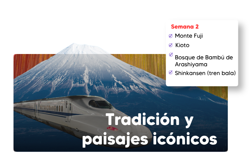 La experiencia se intensifica con recorridos por algunos de los lugares más emblemáticos del país. Descubrirás la serenidad de Kioto, la imponencia del Monte Fuji y la profundidad histórica de Hiroshima. Además, vivirás la experiencia única de viajar en tren de alta velocidad mientras atraviesas paisajes inolvidables.