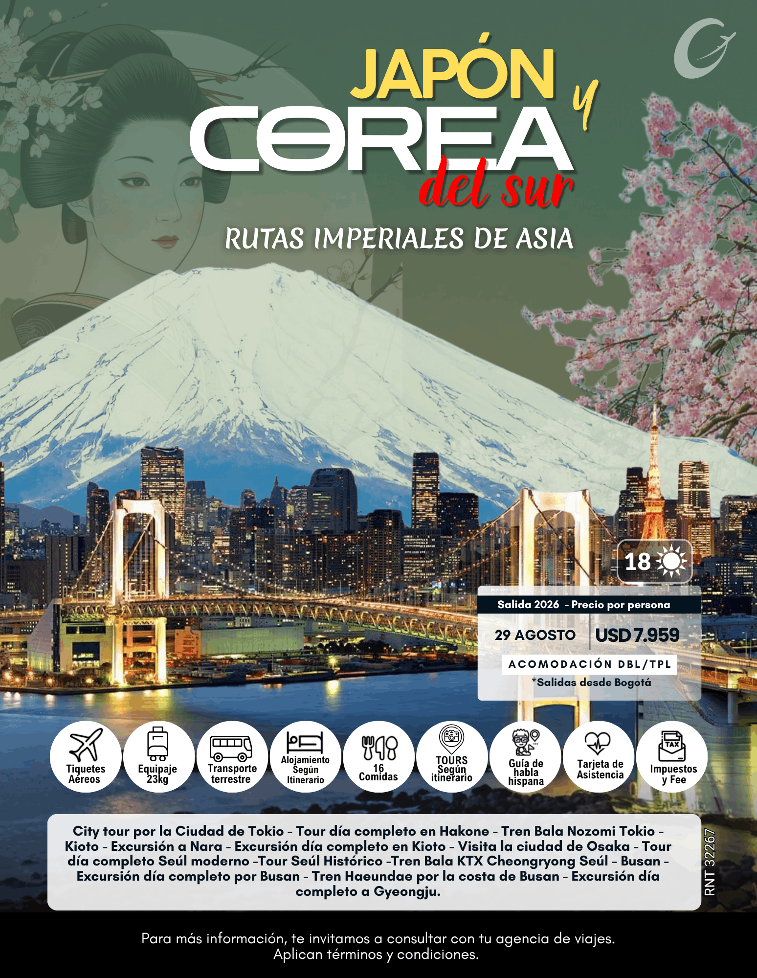 Vive una experiencia única de 18 días explorando lo mejor de Japón y Corea del Sur. Recorre ciudades vibrantes, templos históricos y paisajes inolvidables mientras descubres dos culturas llenas de contrastes, tecnología y tradición. Un viaje completo, cómodo y diseñado para sorprenderte en cada etapa.