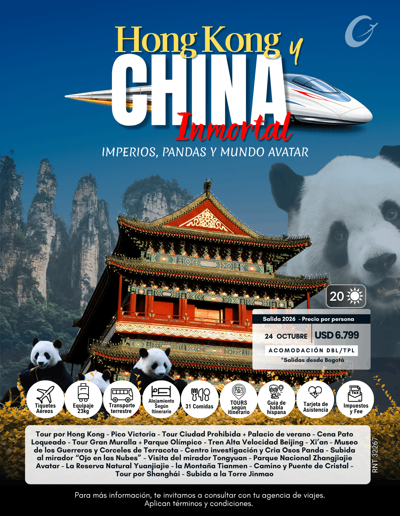 Embárcate en una experiencia única de 20 días explorando lo mejor de Hong Kong y China. Descubre antiguas dinastías, ciudades futuristas, paisajes naturales fascinantes y encuentros inolvidables como los icónicos pandas. Un recorrido diseñado para sumergirte en la cultura, la historia y la magia de un destino que mezcla tradición y modernidad como ningún otro.