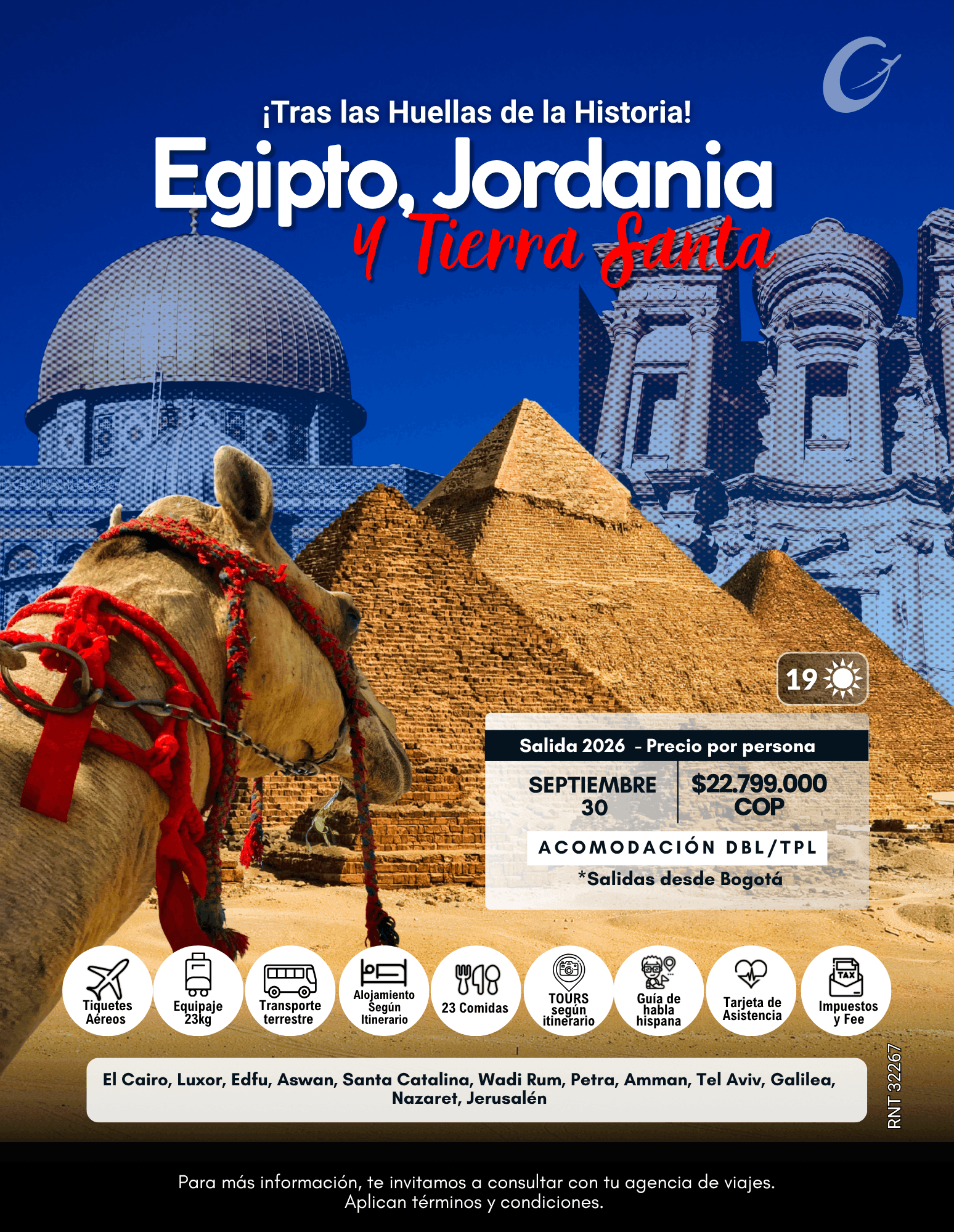 Un viaje que conecta tres destinos legendarios en una sola experiencia inolvidable. Recorre los misterios del antiguo Egipto, maravíllate con los paisajes únicos de Jordania y vive una profunda conexión espiritual en Tierra Santa.