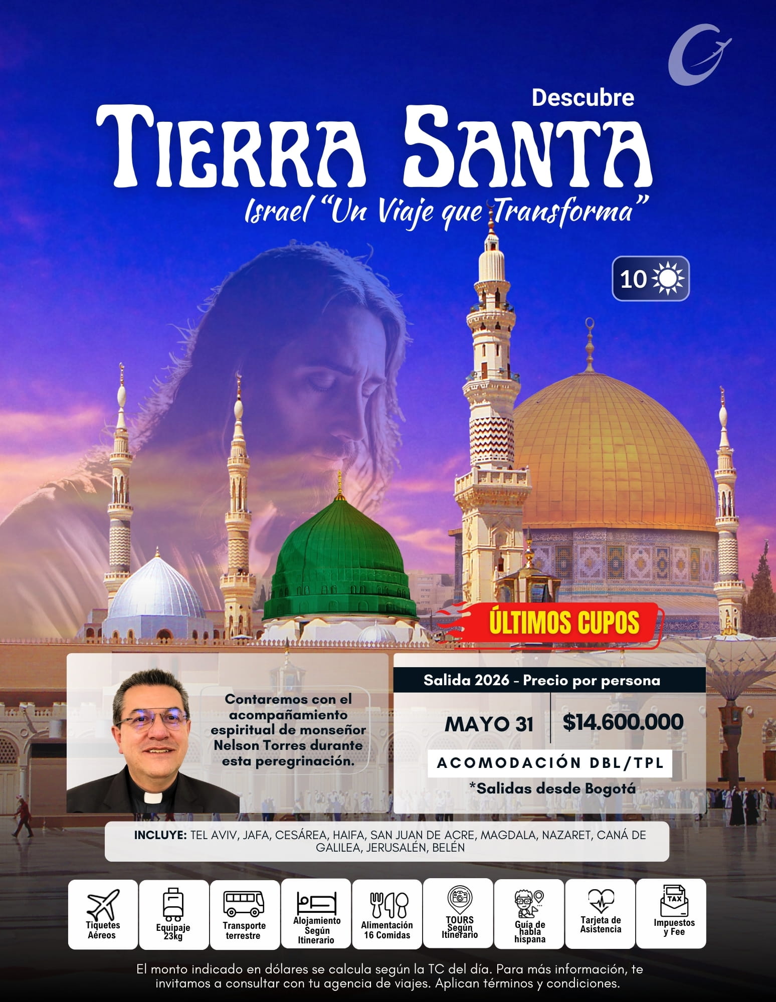 Día 1: (dom 31 mayo) Salida de Bogotá en vuelo internacional hacia Tel Aviv.
